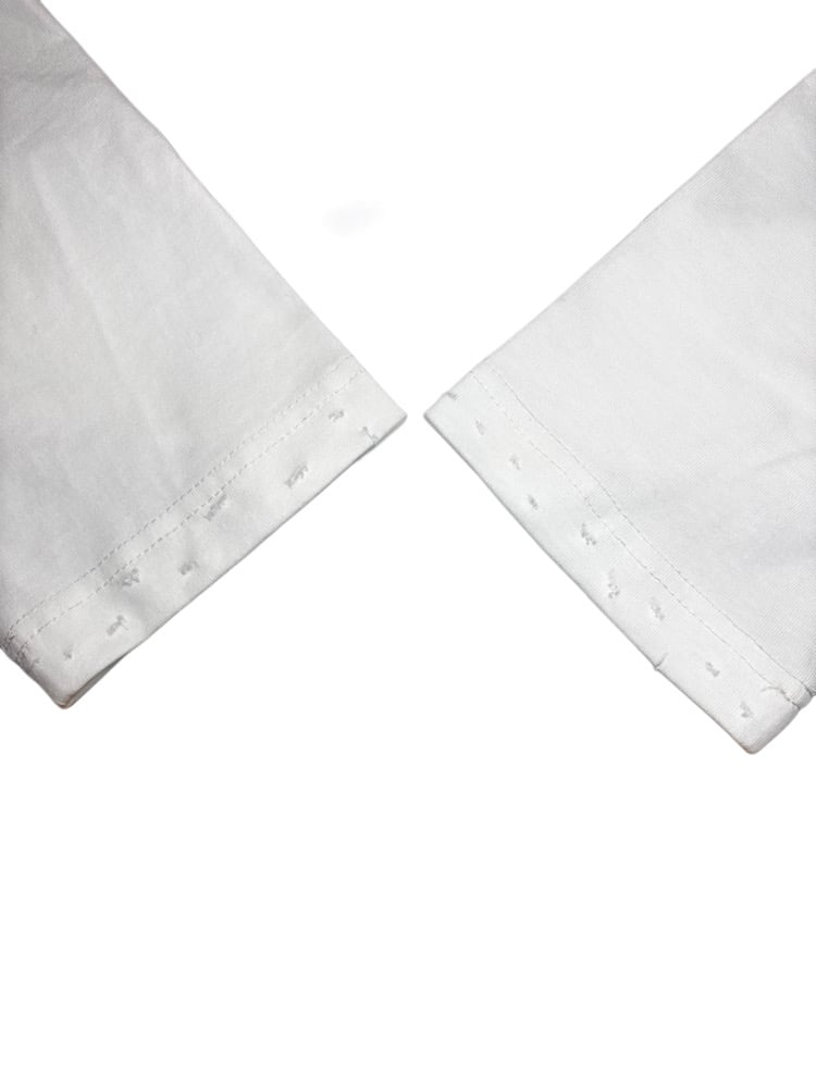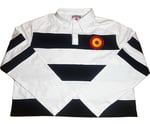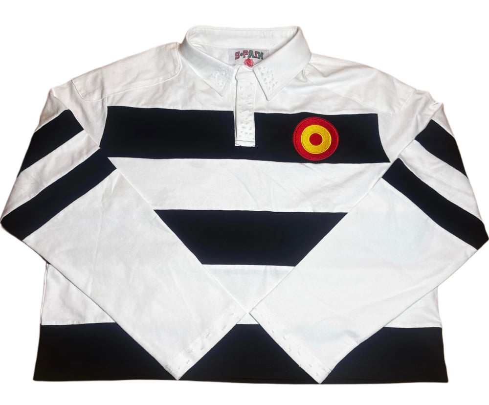 A bold twist on a classic. This heavy-weight rugby long sleeve features oversized black-and-white block stripes with angled sleeve panels for a sharper, more aggressive silhouette. The crisp white collar adds structure, while the textured placket stitching gives it a subtle hand-crafted touch. Finished with a custom red-and-yellow target patch on the chest for a pop of color and identity.
